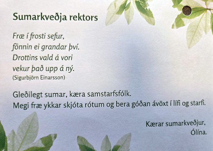 Starfsfólk Háskólans á Bifröst saman í húsnæði skólans í dag til að fagna komu sumarsins. Boðið var upp á hefðbundið vöfflukaffi þar sem starfsfólk átti saman góða stund og gæddi sér á veitingum. Við þetta tilefni flutti rektor starfsmönnum sumarkveðju og flutti ljóðið Fræ í forsti sefur eftir Sigurbjörn Einarsson. Í máli rektors kom fram þakklæti fyrir vel unnin störf á liðnum vetri og óskir um farsælt sumar. Að ávarpi loknu afhenti rektor starfsmönnum sumargjafir skólans.